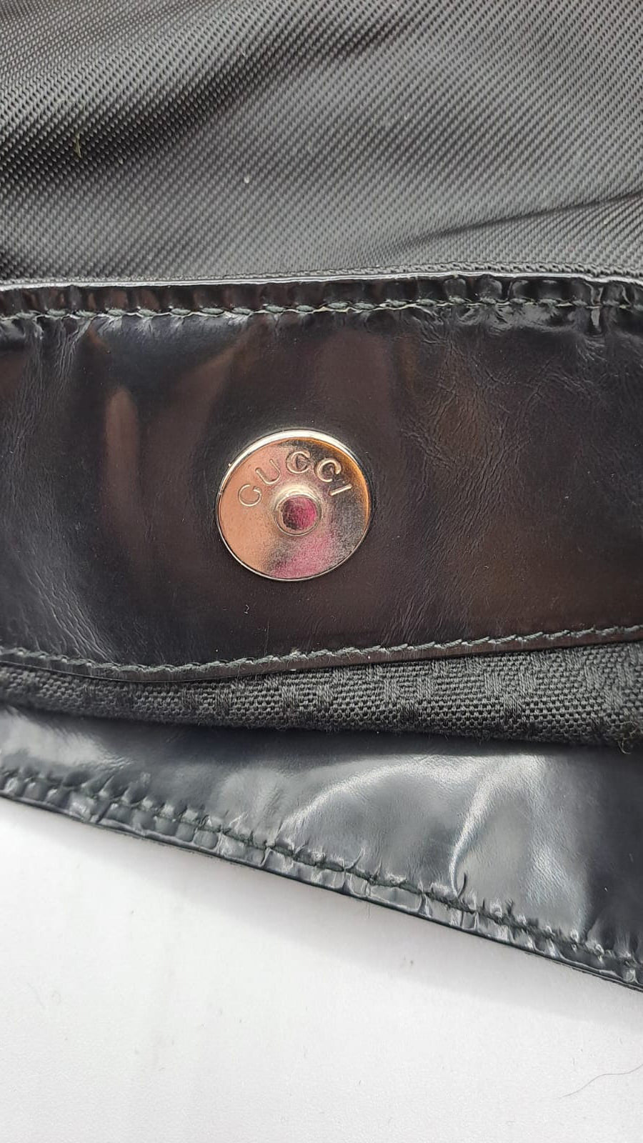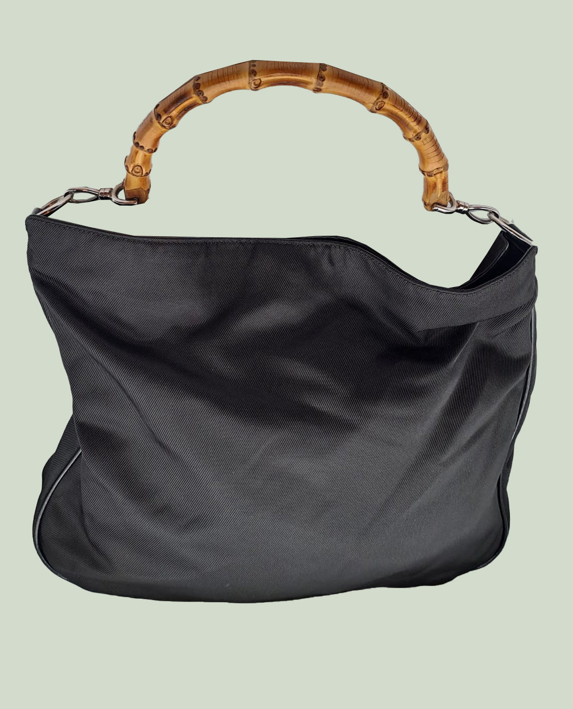 Borsa Gucci vintage anni 90, tessuto nylon nero, manico bamboo, chiusura clips calamitata