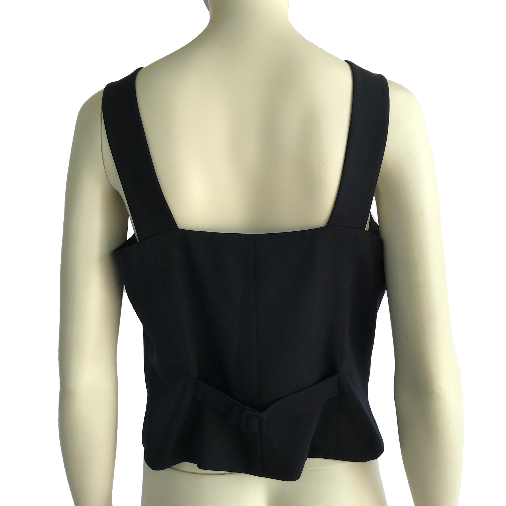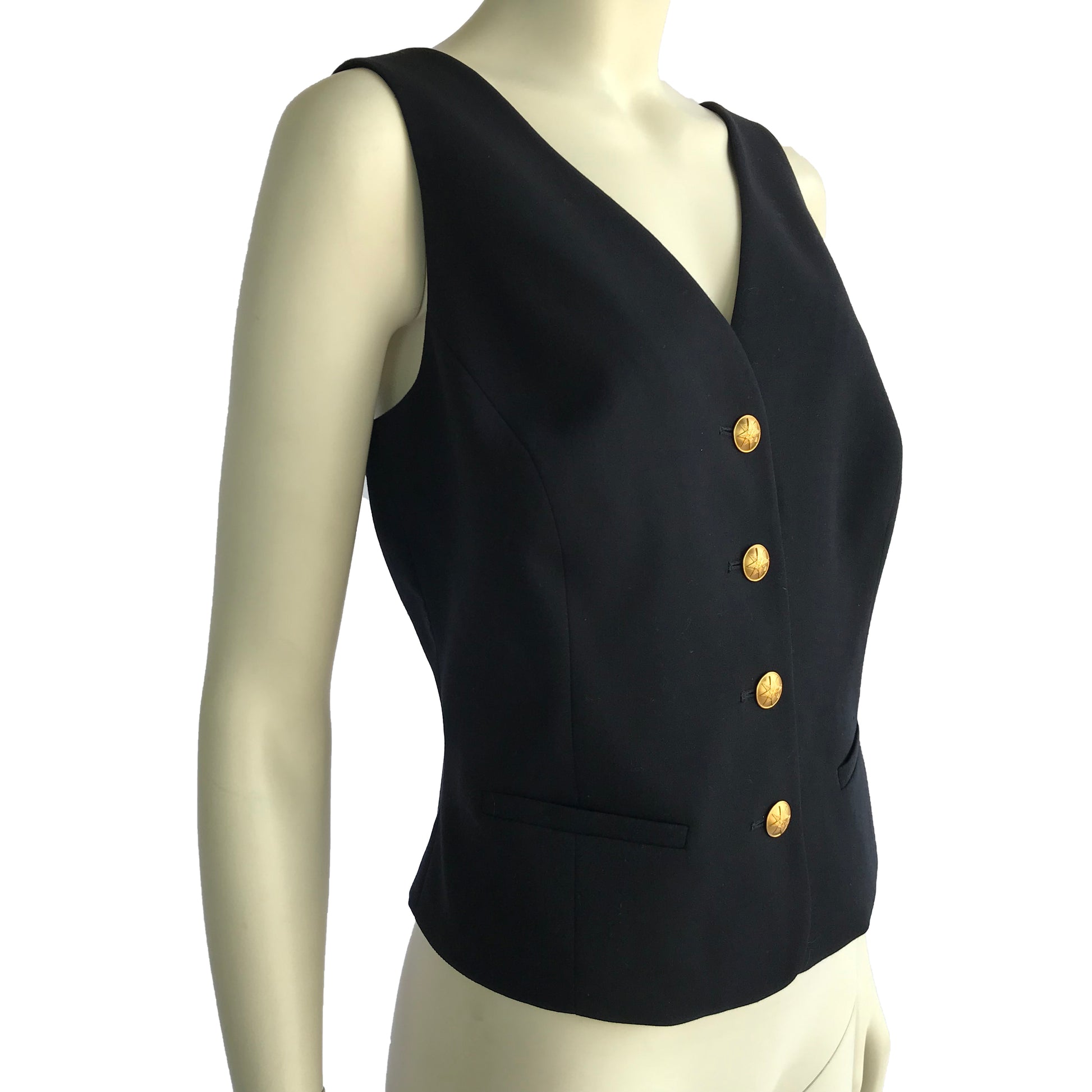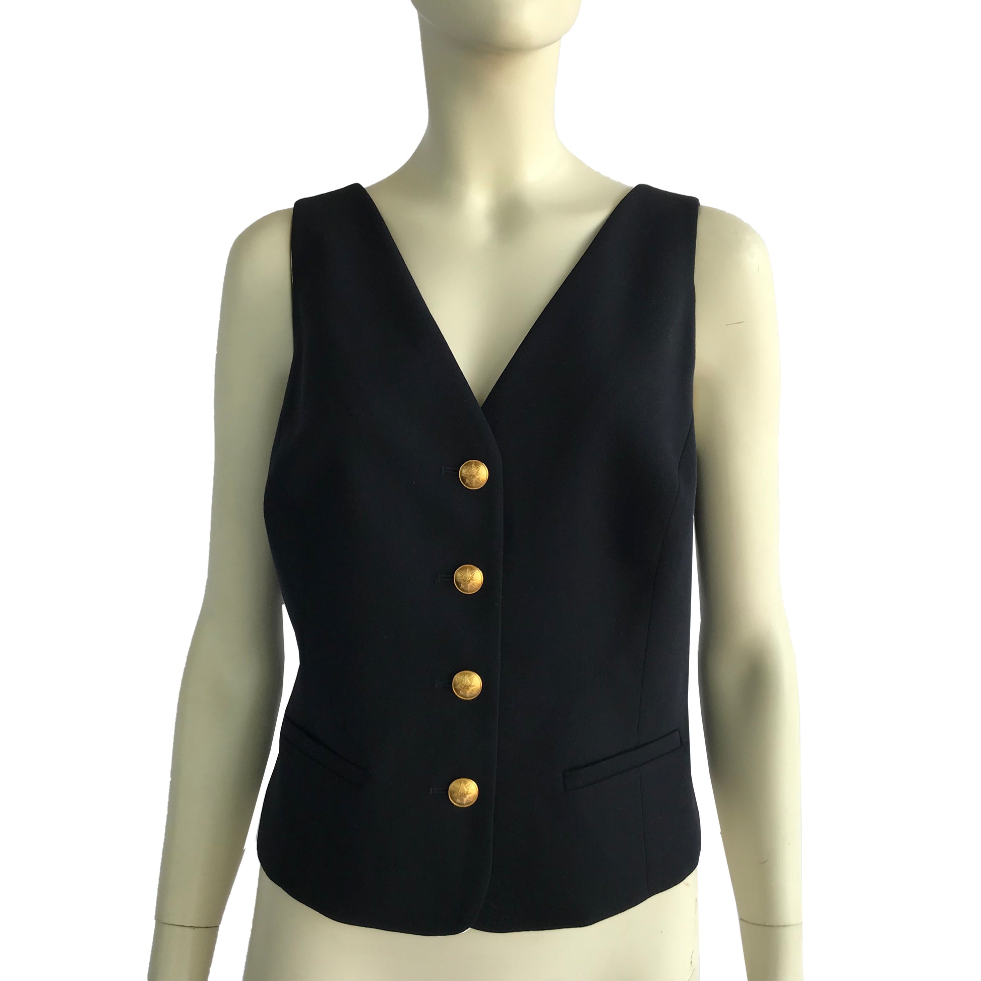 Gilet Les Copains in materiale fresco lana di colore blu, allacciatura anteriore con bottoni gioiello in metallo dorato.